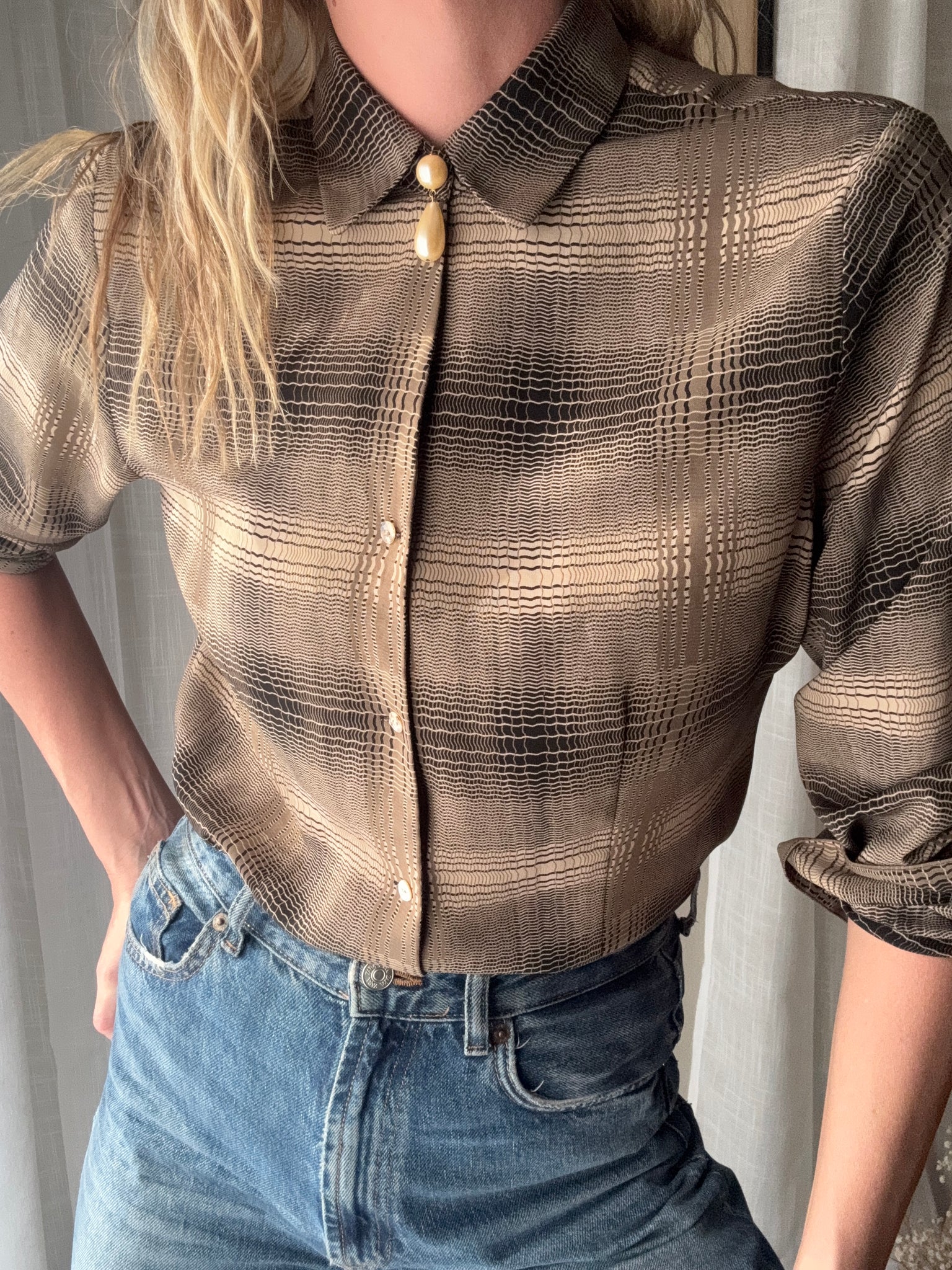 Gorgeous and sophisticated dark beige, black and olive, wavy plaid-patterned collared blouse with front abalone shell buttons and a collared neckline. An elevated basic that is versatile, effortless and timeless!