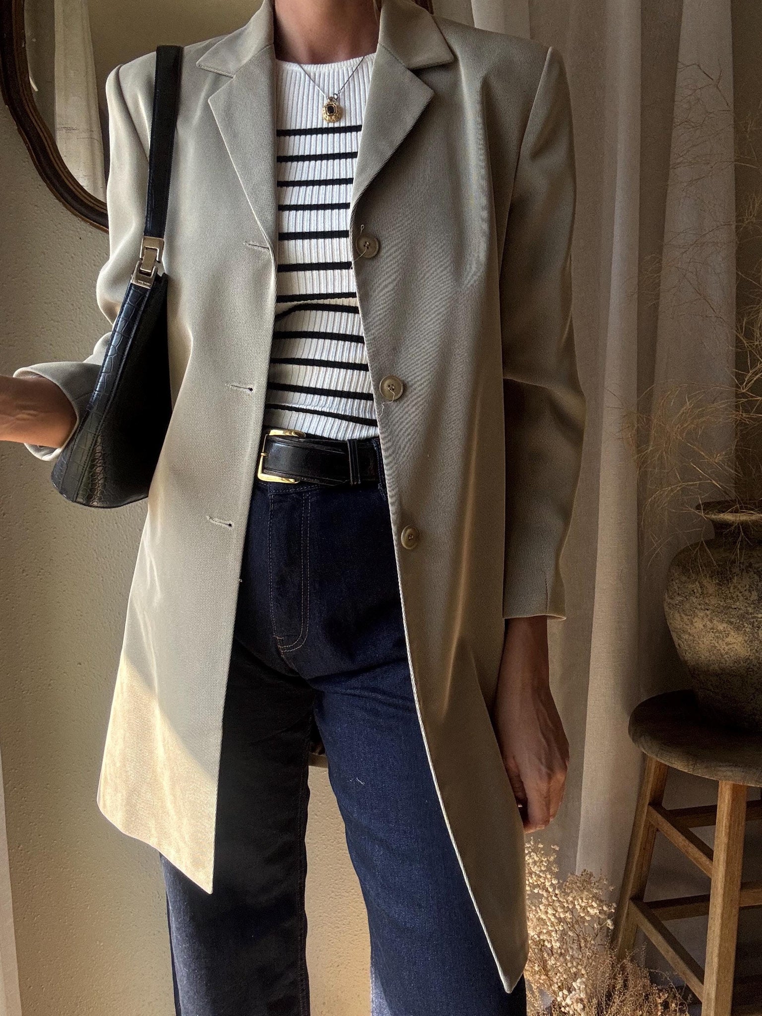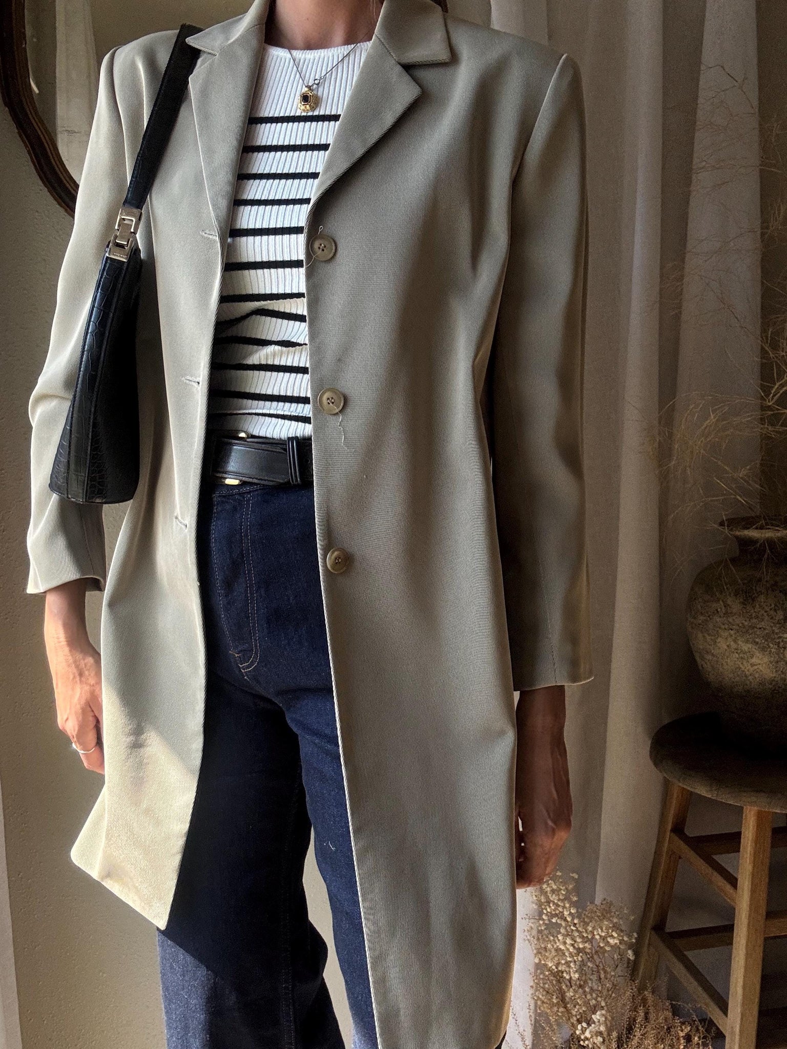 This gorgeous and classic long beige blazer is a classic piece with notched collar neckline, front buttons, slightly padded shoulders and a sleek, extended and modern fit. It is stylish, timeless and can be worn to the office, a night out or a classic white button up and wide leg trousers. Tag Reads: Rachmani | 14 | Made in USA 100% polyester Recommended for size XS-M depending on desired drape & styling but please always refer to measurements to see how this item would fit on you as size can be subjective (can fit smaller sized for a more oversized look) Model is size 28.5” waist, 34C” bust Measurements taken flat approximately: 16" shoulder seam to shoulder seam 18” underarm to underarm 22” shoulder seam to sleeve hem 40” shoulder to hemline  Vintage items may come with minor flaws due to pre-loved wear; imperfections are to be expected. Major flaws will be specifically noted. Due to lighting, color of product may slightly vary compared to photos. I hope you love and appreciate this item with all of its character + charm. The earth and I thank you for shopping small & sustainably. Vintage items are FINAL SALE.
